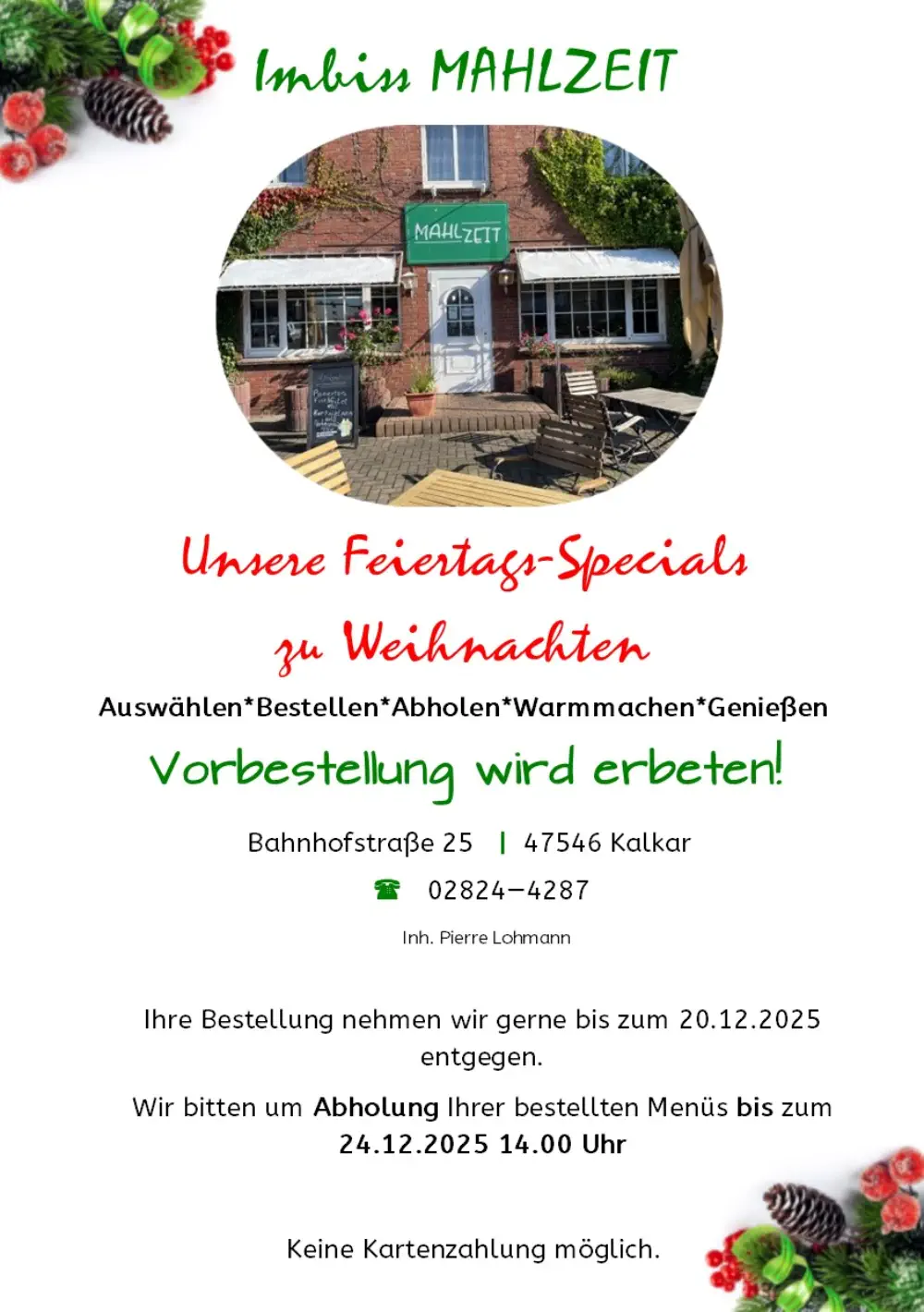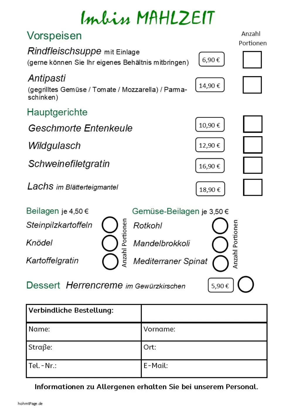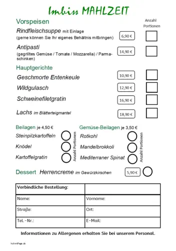 Menü aus und geben Sie Ihre Bestellung im Imbiss ab.